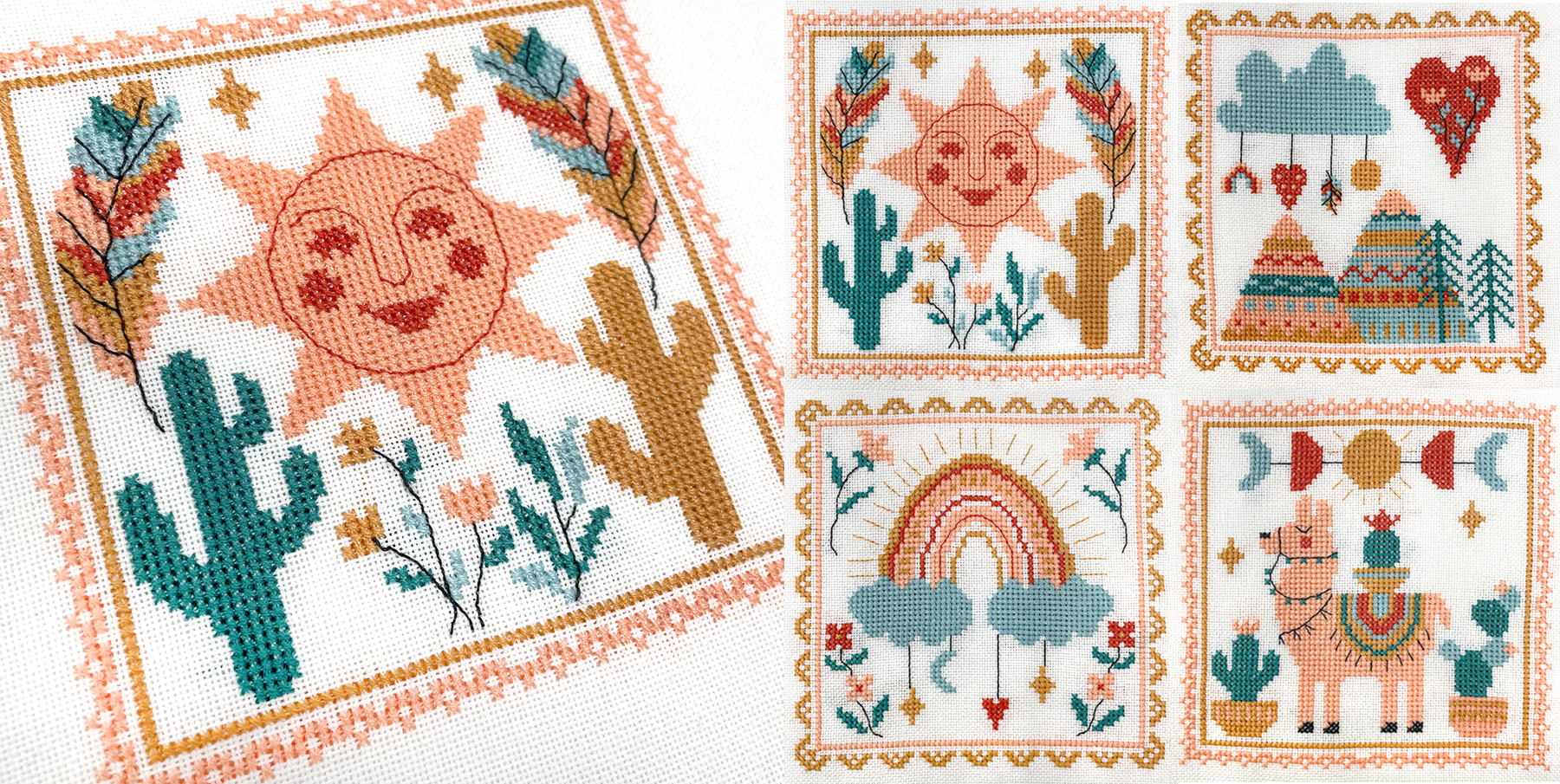 Four cross-stitched panels on a wooden board with decorative elements.