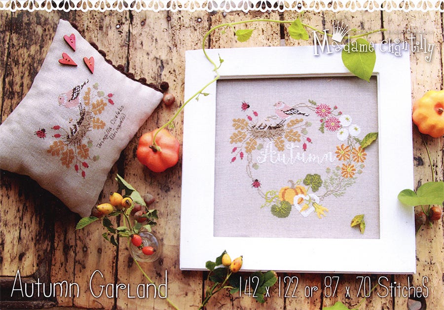 framed cross stitch featuing a blackbird flwoers woman and wagon with multiple pumpkins