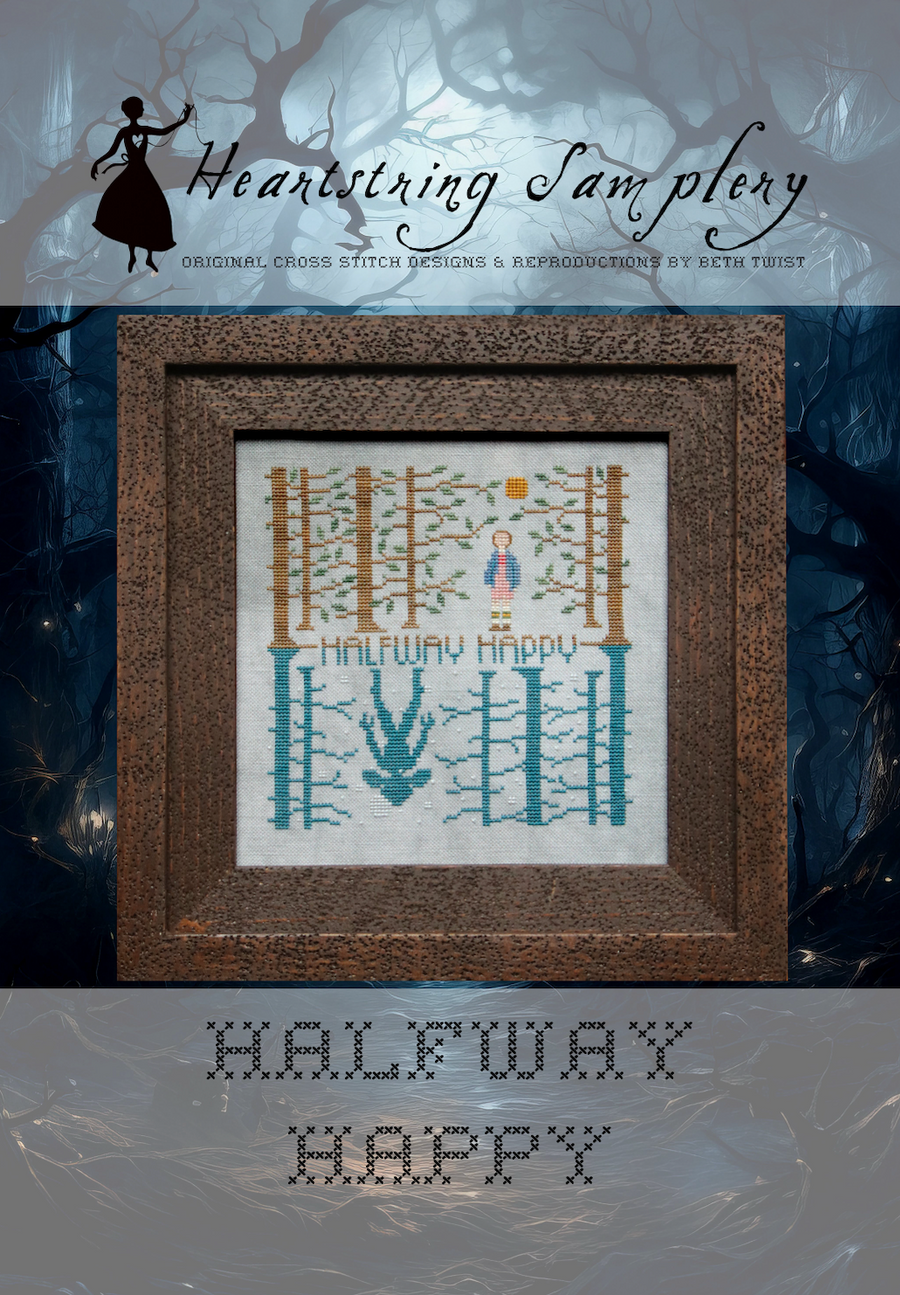Heartstring Samplery cross-stitch pattern with 'E is for Evergreen' design on a textured background.