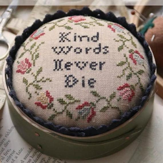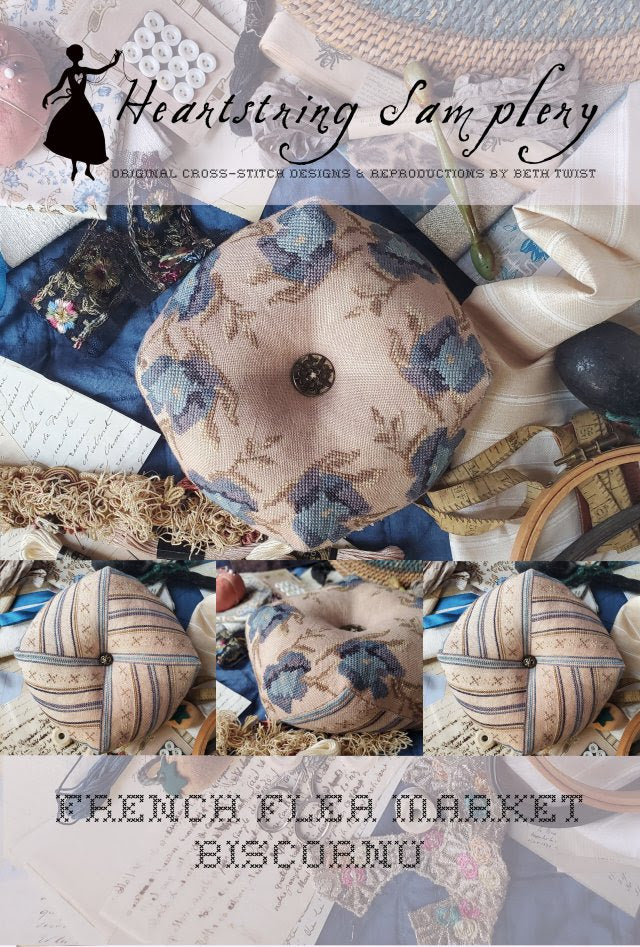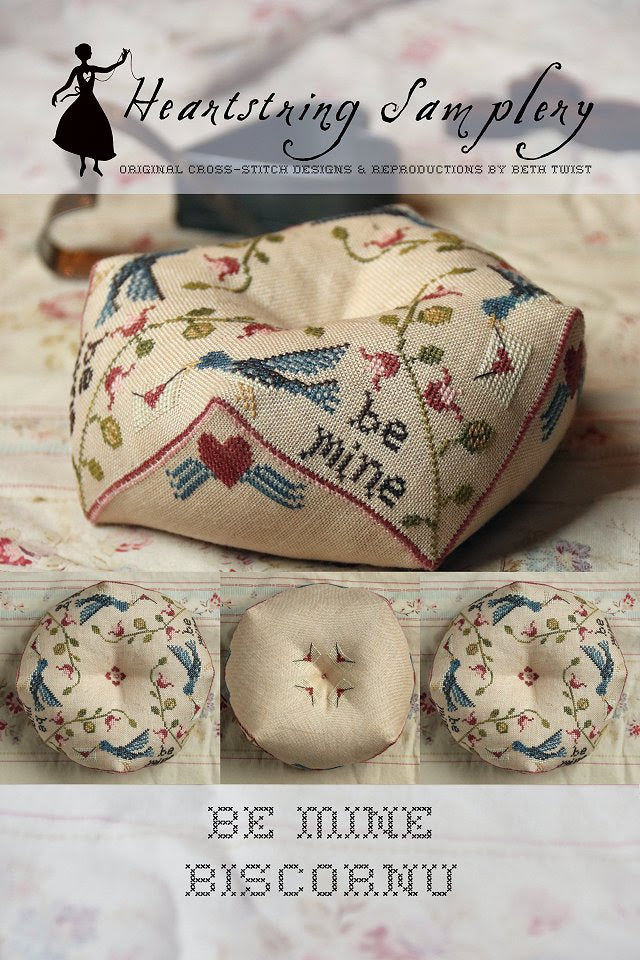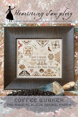 Heartstring Samplery cross stitch pattern framed on a wooden background