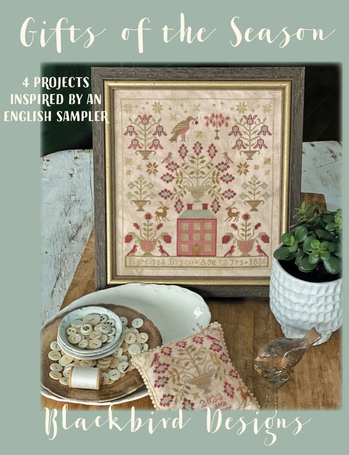 A cover image of 'Gifts of the Season' booklet by Blackbird Designs featuring a framed needlework sampler with floral patterns alongside a spool of thread, scissors, and a needlecase.