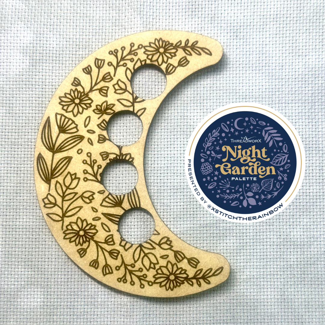 A TopKnot Stitcher Shop exclusive, this Night Garden Floral Moon Thread Keep will keep you floss palette tidy. Threads are not included.