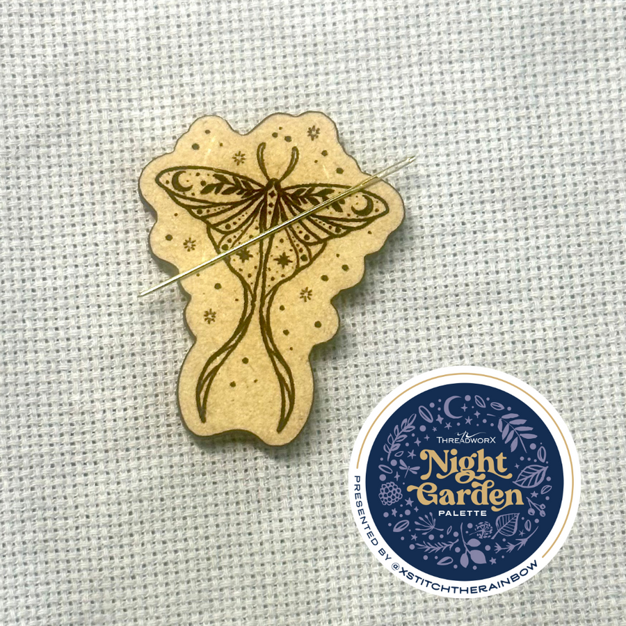 A TopKnot Stitcher Shop exclusive, this Night Garden Moth Needle Minder will keep your needle close on all your Night Garden WIPs.