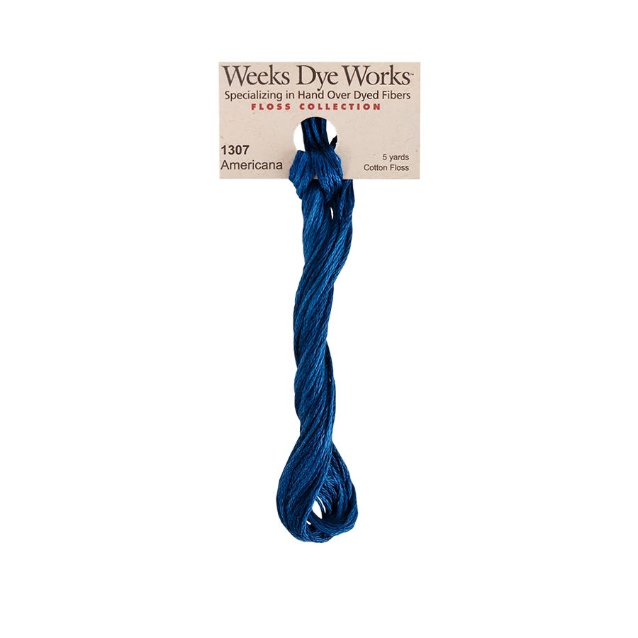 Americana 1307 - 5 yards of Weeks Dye Works Hand-Dyed 6-strand 100% cotton embroidery floss. This high-quality, hand-dyed embroidery thread is perfect for cross-stitch, needlepoint, and other embroidery projects. The image closely represents the floss, but please note that slight variations may occur due to dye lot differences and monitor display settings. Add this unique, vibrant floss to your collection for beautifully detailed stitching.