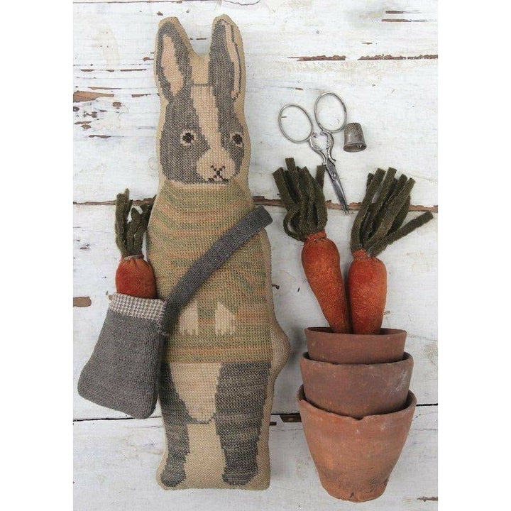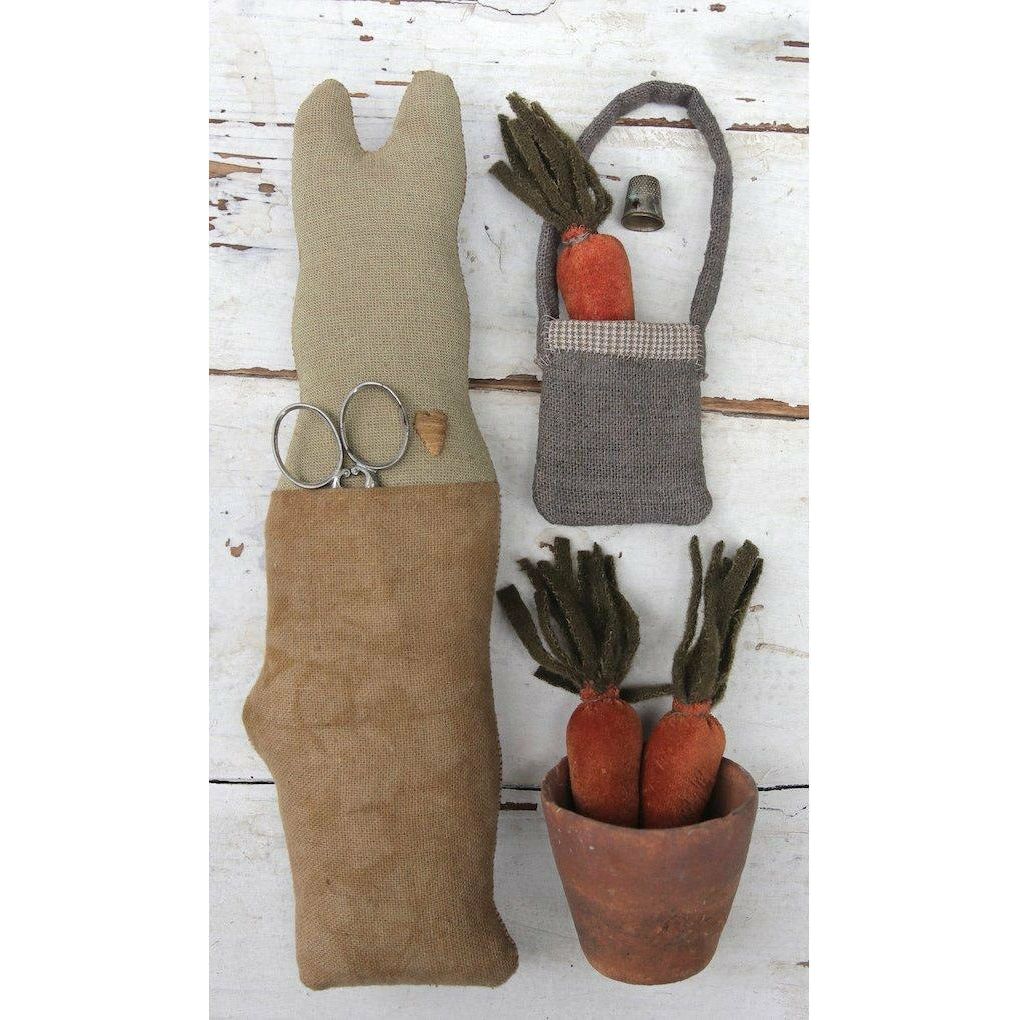 This sweet bunny is holding a satchel full of carrots! Finished into a pillow with a pocket on the back, perfect for stashing scissors (or more carrots)