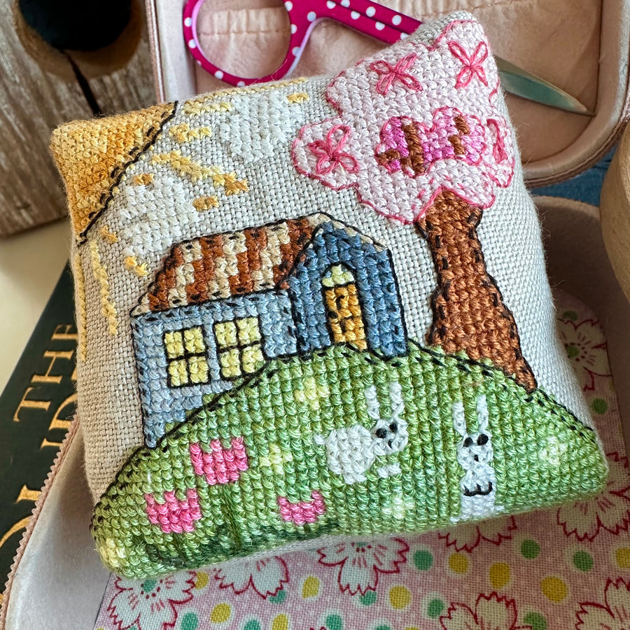 All of the Seasonal Pincushions are stitched on 32 count Country French Cafe Mocha Linen using The Gentle Arts Sampler Threads and Shaker Threads.