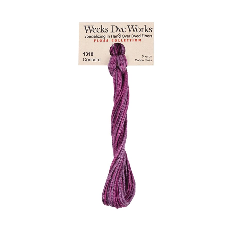 Concord 1318 - 5 yards of Weeks Dye Works Hand-Dyed 6-strand 100% cotton embroidery floss. This high-quality, hand-dyed embroidery thread is perfect for cross-stitch, needlepoint, and other embroidery projects. The image closely represents the floss, but please note that slight variations may occur due to dye lot differences and monitor display settings. Add this unique, vibrant floss to your collection for beautifully detailed stitching.