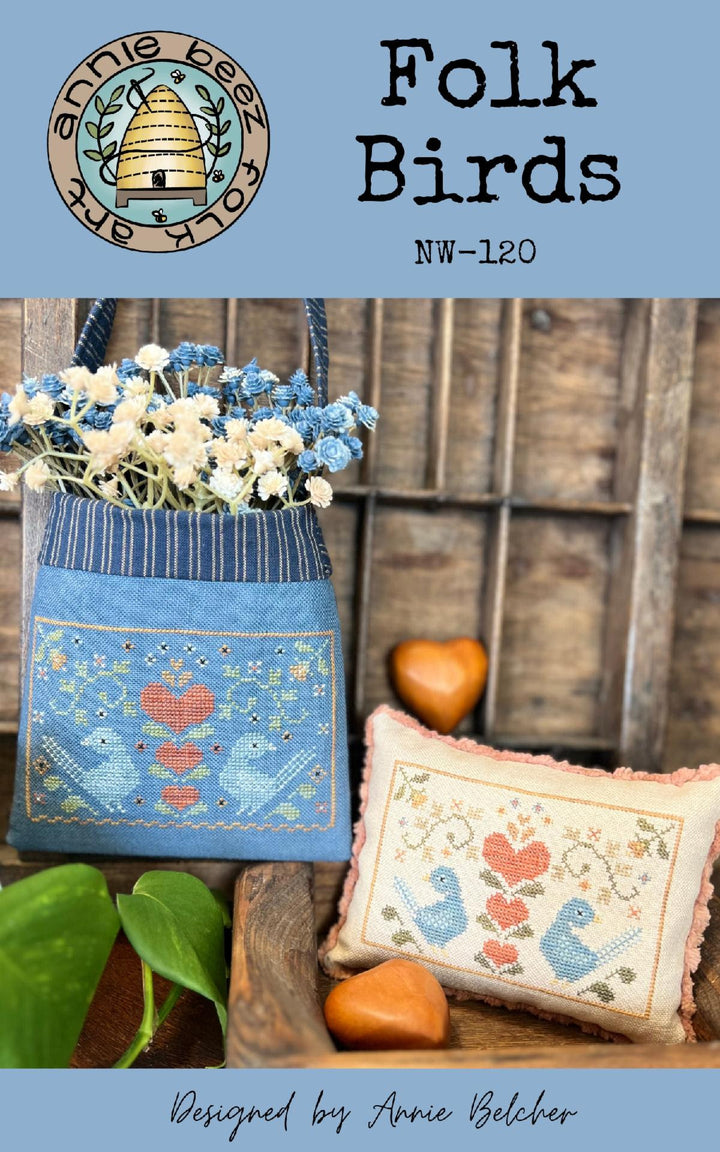 Sweet folk birds stitched on a charming pouch or pincushion. The pattern includes both designs with slightly different thread selections and detailed finishing instructions.