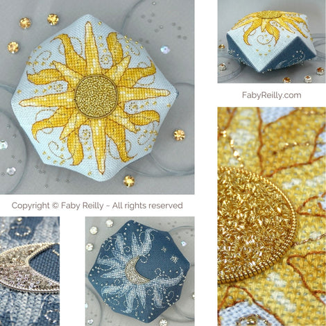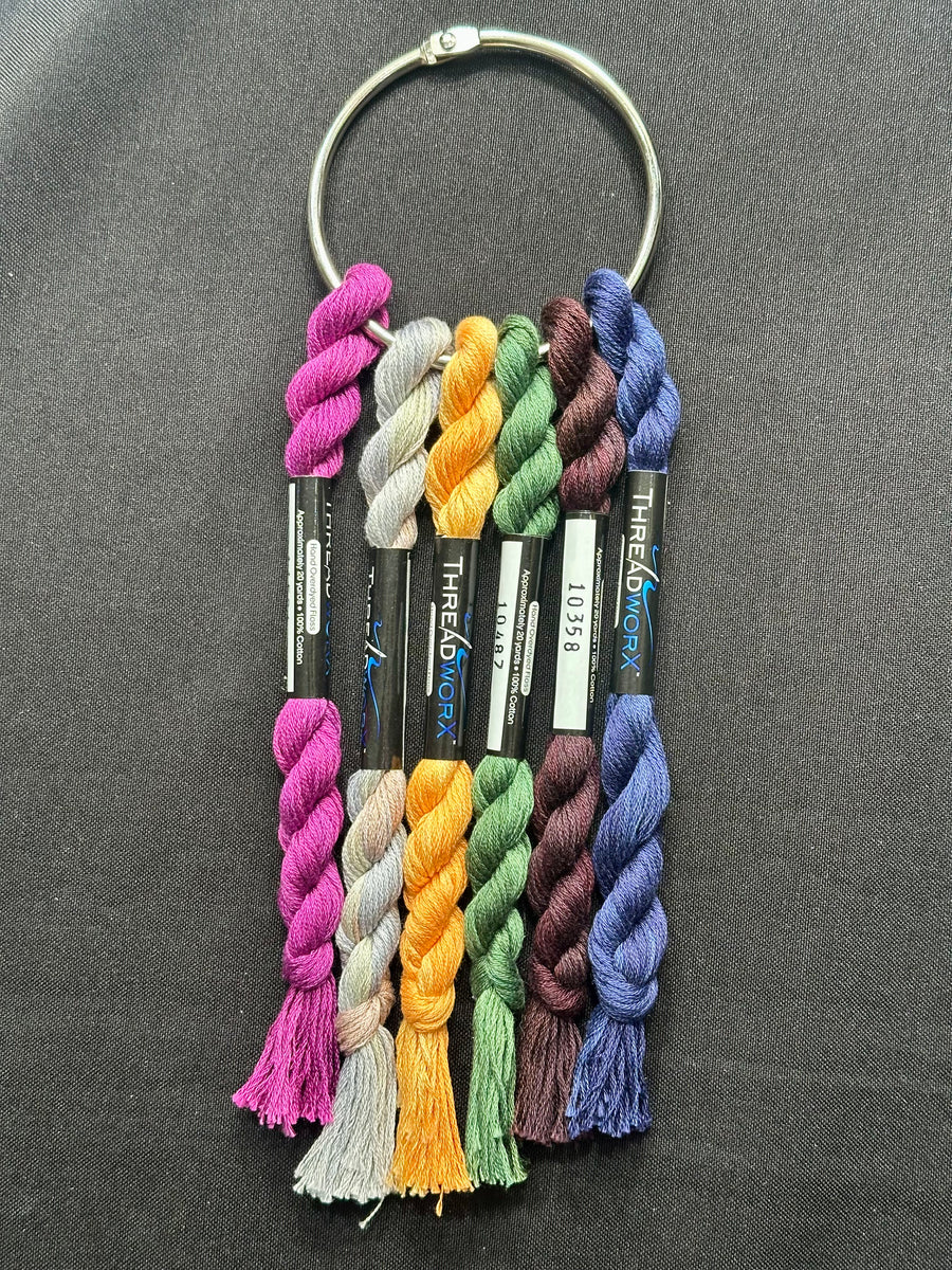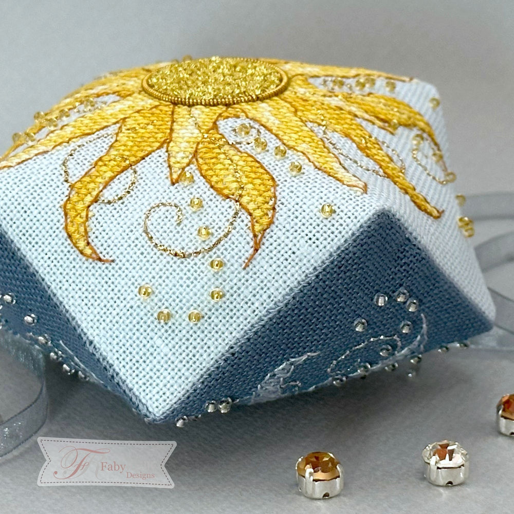 Model stitched two over two on 32 Ct. Meadow Lark using DMC floss and Weeks Dye Works (or all DMC 3825, 844, 333, 606, white, 3829, 783, 367, 3364). Stitch Count: 45W x 45H. Design Size: 3" x 3"
