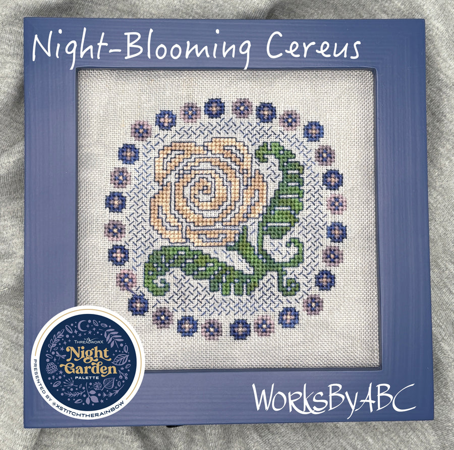 Designer’s note – Sometimes referred to as the "Queen of the Night," the night-blooming cereus is a type of cactus that blooms only at dusk—sometimes for just a single night. This captivating flower was the perfect inspiration for a Night Garden-themed design. This pattern is my contribution to the XStitch the Rainbow collaboration, featuring 20+ designers all using the same four ThreadworX threads to create coordinating designs.
