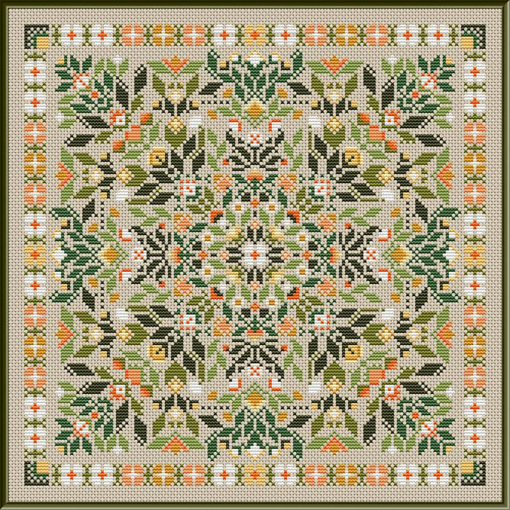 A 151w x 151h bouquet and border design featuring all the colors of orange blossoms. A variety of floral motifs and a border that could also be pulled to use with other projects. All full stitches. Charted with 10 colors of DMC.
