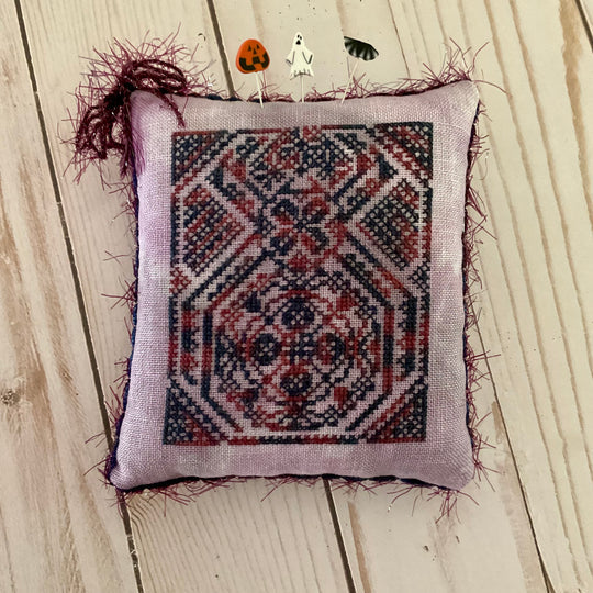 Model was stitched 1 over 2 on "Sea Lavender" linen from Barefoot Needleart using thread from Cottage Garden Threads in "Nightshade". It was finished into a pin cushion by Maria at Wildflower Stitching and stitched by Anna Todd.
