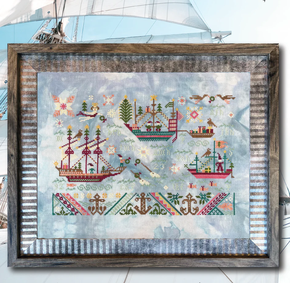 Have you been nautical or nice this year? Either or both, I present to you the Seas & Greetings sampler. It features three ships rigged for the holidays and answers that burning question of how the narwhal came to have a wreath on her tusk. There are several spots for personalization with initials and dates, and a full alphabet/number set is included so you can make it your own.